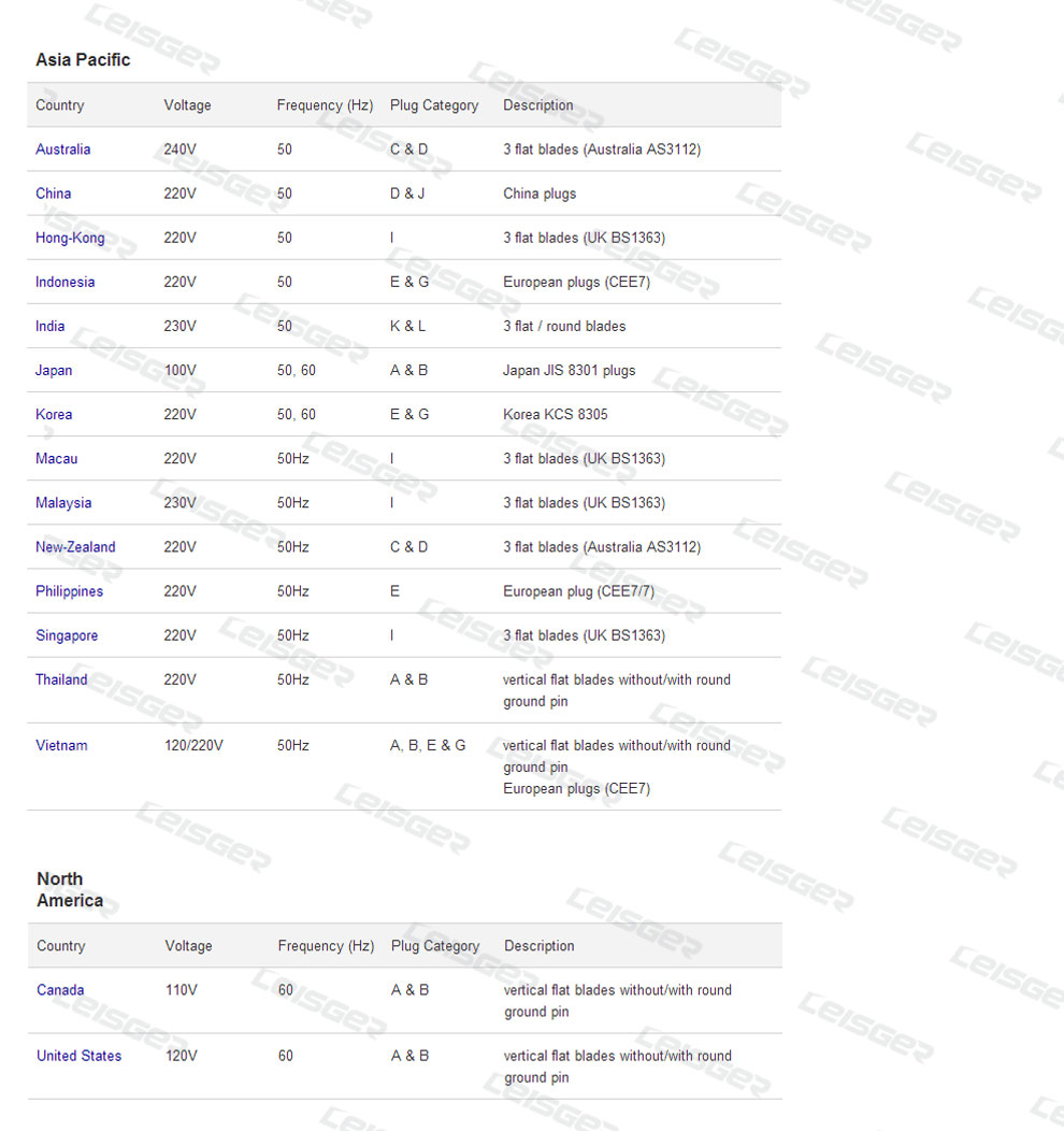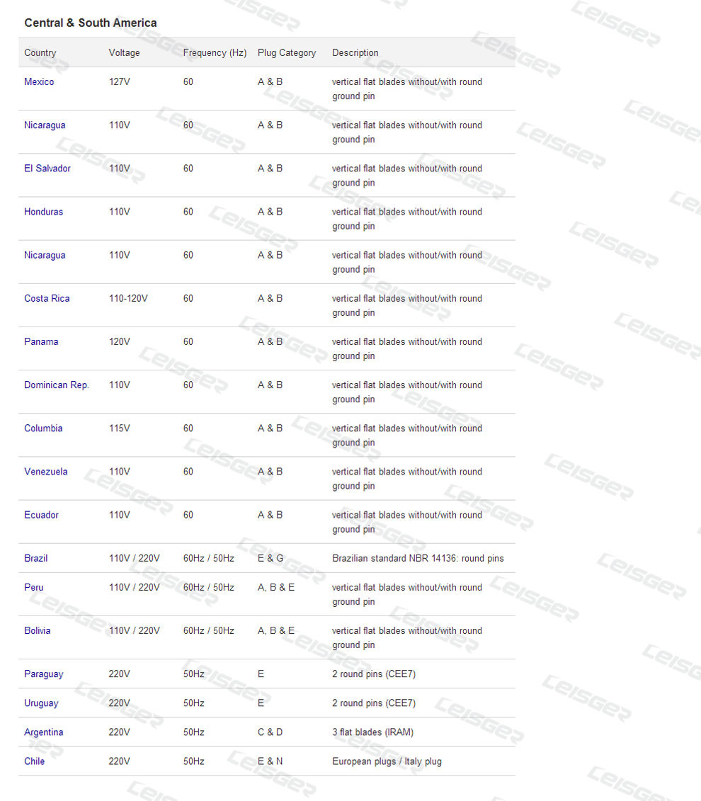 WORLD CHARGER VOLTAGE & PLUG SPECIFICATIONS